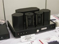 5階へ上がり、エレベーターの前の部屋から取材を開始する。まずはアムトランスのブースで、斬新なデザインのアンプが目に入った。チェコのKR社はこれまでも数多くの真空管が日本に入ってきていたが、これは同社が開発したプリメインアンプである。採用真空管は300BLXSシングルで、20W+20Wと出力は大きい。音は、組み合わせられたソリッドアコースティックのスピーカーを控えめながら高密度に鳴らしているという感じだったが、完全無指向性のスピーカーであることに加えて会場が広いので、少し音が散っていたのかもしれない。