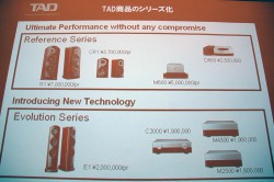 「TADの哲学は『原音に忠実な再生』。アーティストの思いや情熱を伝えるには、余計な味付けのない再生が肝心だと考えている。おかげさまでTADのスピーカーは、HD Tracks主宰者のDavid Chesky氏などプロの方から高い評価をいただいている。2007年のTAD-R1からはじまり、スピーカーからアンプまでラインナップが揃ってきた。近々”Referenceシリーズ”のコントロールアンプを発表する予定。また、“Evolutionシリーズ”のスピーカーについても、もっと手頃で手軽なモデルなど拡充を図っていく予定だ」と今後の展望を語った。