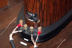 スピーカー端子はバイワイヤリング対応。R1、CR-1と全く同じ真鍮削り出し端子を、10mm厚のアルミプレートにマウントしている。太いケーブルを使用した際や、Yラグ端子を使う場合も、ケーブルに負担をかけない結線が可能だという。