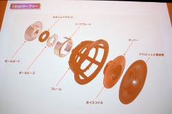 「TAD-E1」は独自の蒸着法で加工したベリリウム振動板使用のCSTドライバーを搭載するなど、「TAD-R1」「TAD-CR1」で培った技術を投入しているのが特徴。14cmコーン型/3.5cmドーム型ユニットを合わせた同軸ドライバーと、18cmコーン型ウーファー2基を搭載した3ウェイフロア型スピーカーで、「TAD-R1やCR-1と比べ、一般のマンションでも置ける現実的な大きさ、そして頑張れば手の届く価格を目指した」(TADラボ社長 平野氏)という。再生周波数帯域は28Hz〜100kHz。最大入力は250W、出力音圧レベルは88dBで、定格インピーダンスは4Ω。