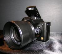 | <左>発表を行った松下電器産業(株)パナソニックマーケティング本部本部長 牛丸俊三氏 <右>DMC-FZ10(レンズフード装着時) |