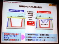佐久間氏によると、この問題の解決に大きく寄与したのが「高純度クリスタル層」で、「技術自体は昨年のモデルから搭載したものだが、これがフルHDの基礎となった。リブの上にある高純度クリスタル層が、プライミング電子や紫外線の新たな供給源となり、発光効率の向上、放電の安定化、描画のスピードアップの3つのメリットをもたらした」。