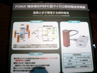 さらに、ユニークな製品として、水と酸素で発電するFOMA端末用マイクロ燃料電池充電器を参考展示。本製品は同社とアクアフェアリー社と共同開発したもので、発売時期は未定。水と水素発生剤を含むカートリッジ内で発生する低圧のガスを、超薄型の発電セルに供給することにより電力を発生させる。1つのカートリッジで約3回分のフル充電ができるという。カートリッジは交換可能で、鞄の中で傾けたりしても水がこぼれる心配はないとのことだ。