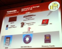 始めに藤井氏は同社の記録メディアに関するビジネス戦略について触れた。藤井氏は東芝にとってキーデバイスとなる3つの記録デバイスが「HDD」「HD DVD」「フラッシュメモリー」であり、同社がそれぞれの分野で革新的な技術を活かした商品化を実現していることを強調し、「東芝がこの3つのストレージデバイスにおけるチャンピオンだ」と述べた。