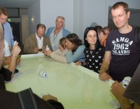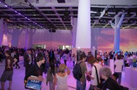 BRAVIAの一斉展示や“ゴールデン・ショーケース”が外周を取り囲むホールを、さらに中央へ向かって分け入っていくと、広々とした“森”のようなスペースにたどり着く。四方を取り囲む白壁にはアンビエントな映像が映し出され、雷鳴やジャングルの生物たちの鳴き声のような聴覚・視覚のスペクタクルが演出される。時折ダンサーのパフォーマンスとともに、ZX1やSountinaなどハイライト商品の映像が壁面に映し出されるショウタイムもある。会場の床から天井まで延びる樹木を模した支柱の周りには、PS3やPSPなどゲーム機の体験コーナーや、“ウォークマン”、“ローリー”などソニーのユニークなオーディオが体験できるコーナーが設けられ、来場者をとことん楽しませる仕掛けも用意。まるで異空間に迷い込んでしまったような驚きのあるブースそのものに魅せられ、長い時間とどまっている来場者も多く見受けられた。