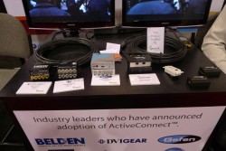 ジェナムは「アクティブコネクト」技術を展示。10mを越えるような長尺時の伝送でも、安定した信号が伝送できる技術だ。伝送に使うケーブルは、安価なBNCケーブル(5本)やLANケーブルを使う。同社技術を搭載した製品は「GEFEN」や「MONSTER CABLE」などから発売される予定だ。