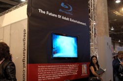 さて、ポルノスターに気を取られずに、さっそく調査結果を報告しよう。北米のアダルトビデオのBD化は、日本よりも格段に進んでいると断言できる。特にVIVIDやDIGITAL PLAYGROUND(DP)やWicked、elegantangelといった大手メーカーは、主要作品のほとんどをBDでもリリースしている。中でもDPはブースの巨大な外壁を利用してBDソフトをアピールし、かなり気合いが入っている。elegantangelも、ブースの1コーナーを割いて、1080p収録の高画質ぶりを訴求していた。