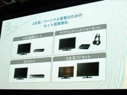 続けて栗田氏は、販売戦略についてセット提案を強化していくことを発表。「薄型テレビの世帯普及率は6割を越えたが、家庭内にはまだまだ多くのアナログテレビが残っている」と述べ、2台目需要やパーソナル需要を意識した提案を行っていくとし「家庭内のテレビ全てを早くHD化していく」とコメント。DLNAを使ってのネットワーク化の推進などで「新しいテレビの楽しみ方の普及に弾みをつけていきたい」と語った。