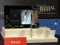 デジタルフォトフレーム“S-Frame”のコーナーでは、「DPF-X1000」など現行モデル各機種に加えて9V型の大画面モデルなども参考出品。スワロフスキーの装飾をあしらったモデルなども展示していた。