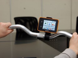 自転車モードと徒歩モード用では、屋外で使用することを考慮してIPX5相当の防滴性能に新たに対応。運転時にはカーナビ画面を見られない自転車の特性を考慮し、走行時は音声ガイドのみを行い操作時のみ画面表示をオンにする「スーパースタミナモード」により、11時間というロングバッテリーライフも実現した。