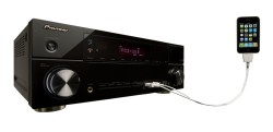 「VSX-820-K」はAVアンプとして初めて「Works with iPhone」認証を取得。本体前面に搭載されているUSB/コンポジット映像入力端子に付属のケーブルでiPhoneを接続し、iPhone内のコンテンツが再生できる。接続中はiPhoneの充電にも対応している。フロントにはまた「iPhoneコントロールボタン」を配置し、AVアンプからiPhoneを操作することも可能だ。なお、同じ付属ケーブルで接続して、iPhone以外にもiPod classic、iPod nano、iPod touchも同様に連携操作が行える。
