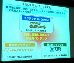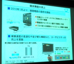 また新しい機能追加として、米国ではすでに行われているという「スタートオーバー機能」を提供することも発表された。本機能はレコーダーなしで放送中の番組を番組のはじめから追っかけ再生できるもので、坂東氏によると「2010年度内にトライアル提供を予定している。スタートオーバーのサービスを行うには放送中にVODを配信できる権利の許諾が必要になる。現在コンテンツを探しており、話を進めているところ」だという。