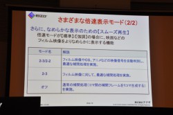 倍速モードを「標準」「強調」にすると、アニメや映画など24fps/30fpsのソースを2-3プルダウン、または2-2プルダウン表示する際に最適な中間フレームを予測し、補間・再生する「スムーズ再生機能」も併用して設定できる。