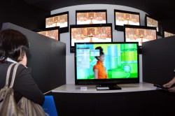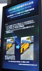 また、次世代の高圧縮映像符号化技術の参考展示も行われていた。こちらはMPEG-2の約4倍、H.264の約2倍の圧縮性能を持つという。これまで等分割だったブロックサイズを、この技術では平坦な領域では大きなサイズ、複雑な領域では小さなサイズ…というように、画像信号に合わせてサイズ拡張・適応化を行う。これにより効率のよい圧縮が実現するとのこと。2012年7月の標準化を目指しており、「H.265」となる見込みとのこと。。「将来的には携帯電話でデータ量の大きな動画を見たり、スーパーハイビジョン放送の伝送時などに活用したいと考えている」(同社説明員)のことだ。