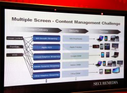 このMEDIOSを構成する技術の一つが「Secure Media」だ。現在、タブレットやスマートフォン、PC、STBなど様々なデバイスが登場し、これに伴って使われている著作権管理技術(DRM)も複雑化している。Secure Mediaでは、これらの複数のDRMを、「Encryptonite ONE」(HLS+)という独自のDRMを用いることで配信側で一括管理でき、様々な機器へ対応させることが容易になる。