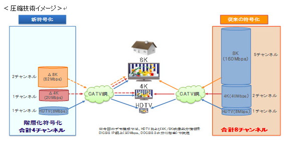 CATVの1チャンネル分の伝送レートは38.88 Mbps(256QAM利用時)で、従来の伝送ではフルHD映像に1チャンネル、4K映像に2チャンネル、8K映像に5チャンネル分の帯域が必要だったが、今回開発された新技術により、従来比約1/2となる4チャンネル分の帯域で、フルHD映像・4K映像・8K映像の同時伝送が可能となった。