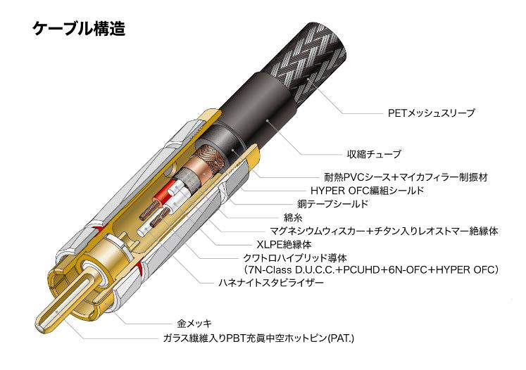 ケーブル外側のPVCシースに添加し、高弾性率・高アスペクト比の板状フィラーにより剛性・寸法安定性・制振性を高め、高域/低域のレンジ拡大、低域量感の向上、解像度向上による音像の明瞭化を図ったとしている。