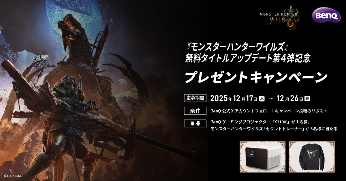 ベンキュージャパンは、ゲーム『モンスターハンターワイルズ』の無料タイトルアップデート第4弾の配信を記念し、ゲーミングプロジェクターやオリジナルグッズが当たるキャンペーンを実施する。