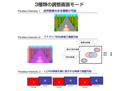 なお、3Dメガネを外した状態で視差を確認するための表示モードとして、赤と青の映像で出力するアナグリフモードのほか、LとRの画像を0.5秒単位で交互に出力するLRシーケンシャル表示も装備するが、後者は3D映像製作者の要望に応えて搭載したという点が興味深い。熟練した3Dクリエーターであれば、交互に出力される映像を見て立体効果を判断できるのだという。
