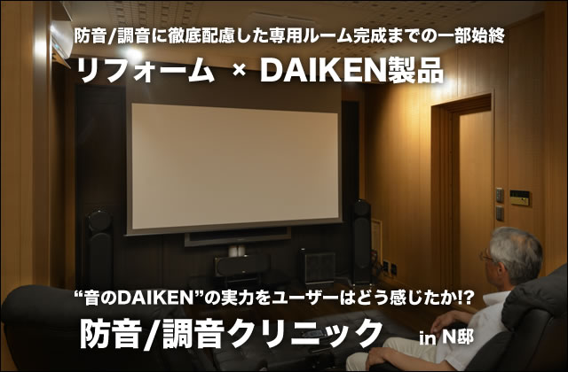 音に対する研究を長年積み重ねてきた“音のDAIKEN”の製品を使って防音/調音の悩みを解決していく本企画。読者訪問第3弾では、和室2部屋を大胆にリフォームしてホームシアター/オーディオ専用室を作った大阪府のNさんが登場。このシアタールームでの音の響き方や防音能力をDAIKENスタッフが実際に計測するなどで、DAIKEN製品の実力を確認した。