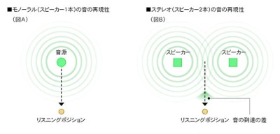 図説のとおり、スピーカー1台によるモノラル再生の場合は、音源の波面はきれいな同心円を描きリスナーに届く。それがステレオの2音源となると、互いに波面が干渉しあうのは分かるだろう。空間を共有する以上これは当然だ。結果、リスニングポジションでは左右のスピーカーから届く音波の谷間となって、少しても首をふると定位が不鮮明になったりアタック音の到達が遅いためになまった音、リアルさの欠如したサウンドになるのだという。