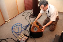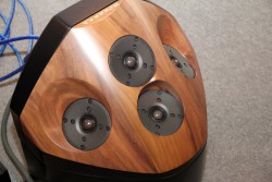 左右上下独立の4個のユニットはスキャンスピーク製。無秩序にあちこちを向いているように見えるかも知れないが、その方向と位置の精度は研究につぐ研究の結果たどりついたものだ。左右は4kHz、前後は10kHz以上で放射音のトリニスター効果(音場創成効果)が出るような設計。これを収めたエンクロージャーは60mm厚のウォルナットとホワイトアッシュの無垢削り出しを効果的に組み合わせたリアルウッドで、精度と剛性を高める専用台がオプションで用意されている。ネットワークはパーツにこだわり外付けとした。本体と外付けネットワークの間は、付属のZonotone製特注ケーブルでつなぐ。広い部屋やハイエンドスピーカーに対応する完璧な仕様である。