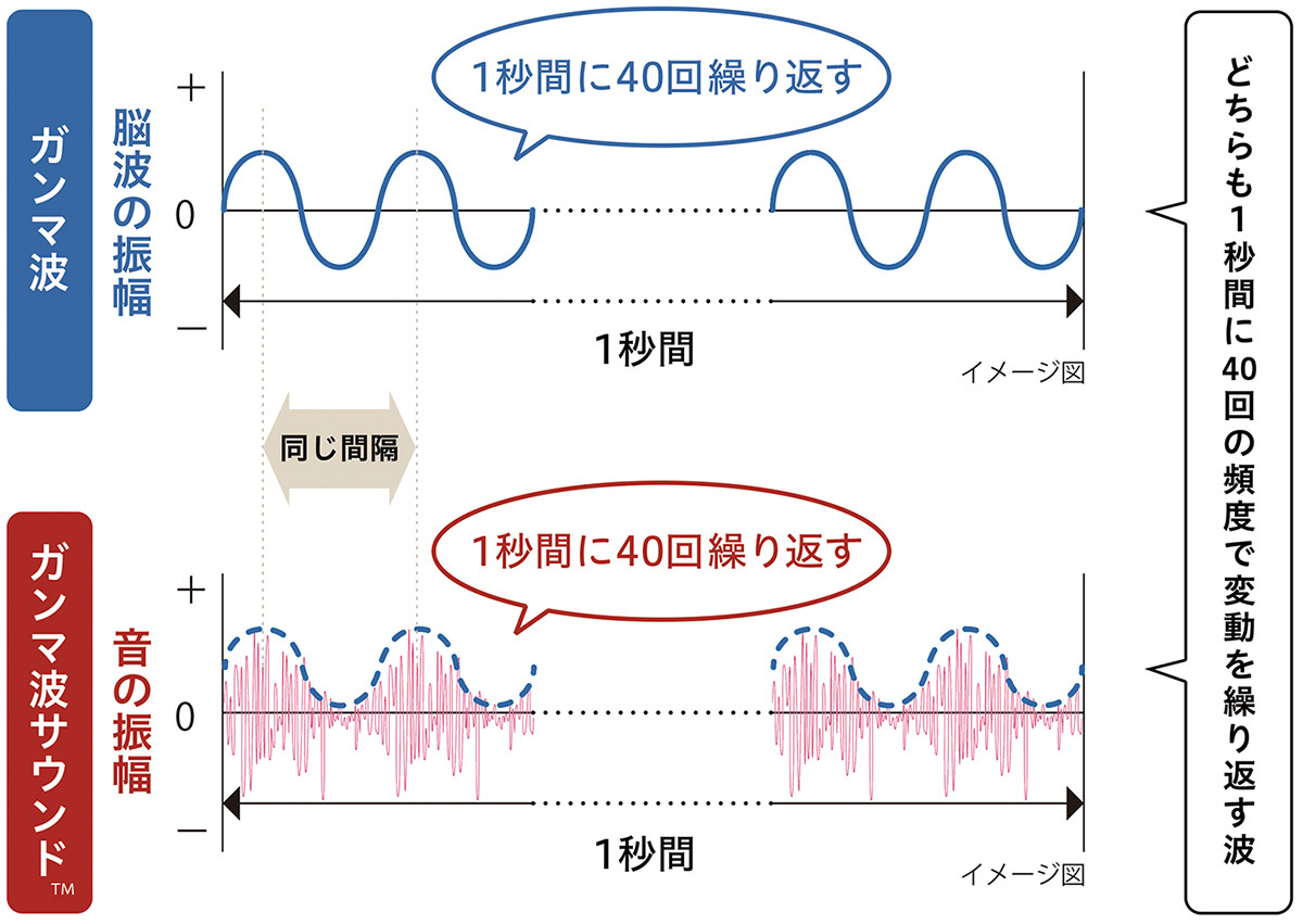 なお、 ガンマ波サウンドTMは入力される音声に含まれる部分信号に40Hzの振幅変調を行って音声を加工する技術。音のすべてを変調するわけではないので、音楽や音声が聴こえなくなるわけではない。音楽や音声と同時にガンマ波サウンドTMを再生できる点がポイントだ。