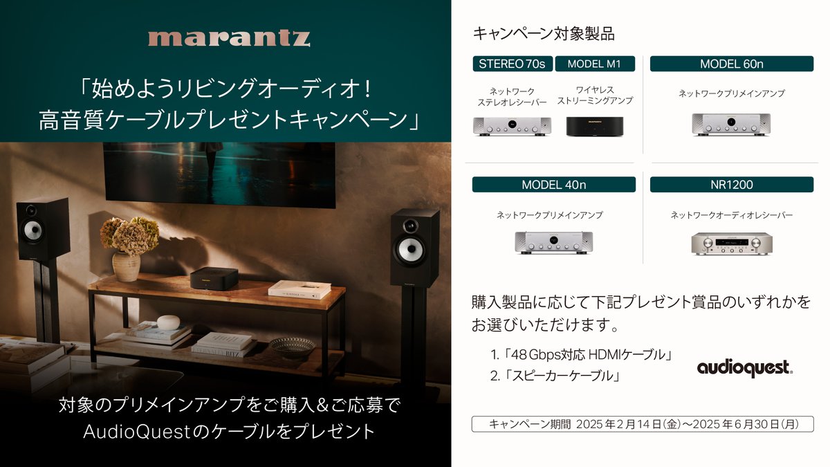 今回のキャンペーン対象となっているのは、HDMI端子を搭載するプリメインアンプ「MODEL M1」「STEREO 70s」「MODEL 60n」「MODEL 40n」「NR1200」の合計5モデル。購入者全員に、AudioQuest製のHDMIケーブルかスピーカーケーブルがプレゼントされる。