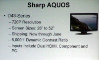 D43シリーズは、LC-52D43U、LC-46D43U、LC-42D43U、LC-37D43U、LC-32D43U、LC-26D43Uの720pモデル6機種で、エントリークラス的な位置づけとなる。パネル解像度は1366×768。ダイナミック・コントラストは6,000対1、応答速度は6msとなる。