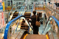 店舗前の看板やチラシなどでは、「他社にはまねできないお客様への5大サービス」と銘打ち、全館に上り・下りの専用エスカレーターを完備したことや、来店者専用エレベーターを3台用意したことをアピール。ビックカメラ池袋本店には下りエスカレーターがなく、エレベーターも一部で荷物用のものを併用していることを意識したのは明白だ。また、各階にトイレを配置したほか、身障者用のトイレも1階に設置。さらに各階には休憩スペースも設けられている。