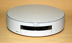 VGF-HS1はVAIOテレビサイドPC「TP1」と似た、平べったい円筒形をしている。直径270mm、高さ71mmなので、直径は同じで、高さがやや低い。サイズが小さいのに比例し、重量もVGX-TP1DQ/Bの約3.5キロと比較すると、約3.1キロとやや軽くなっている。