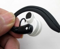 本機は、スピーカー部分が耳の穴の手前に留まるというユニークな設計になっている。通常のイヤホンのように耳の中を圧迫しないので、音楽を長時間聴いていても疲れにくいのだという。