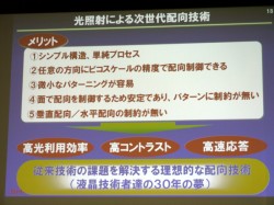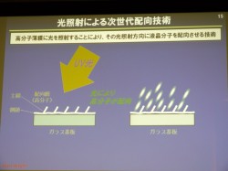 新技術のUV2Aは、高分子薄膜にUV光を照射すると高分子が照射方向に向き、液晶分子がその方向に沿って並ぶというもの。光を使って配向を行う、世界初の新技術だ。実現には、全く新しい分子構造の光配光膜材料を独自開発したことが大きく寄与したという。同社 代表取締役副社長の井淵良明氏は「液晶開発で40年の歴史を持つ当社が『液晶分子の気持ちになって考えた』技術」と説明。また同社 常務執行役員 研究開発本部長の水島繁光氏も「従来技術の課題を解決する、現在において理想的な配向技術。液晶技術者たちの30年来の夢がかなった」とその意義を強調する。