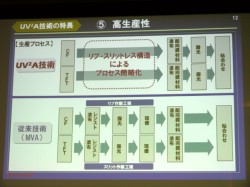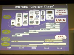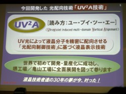 また水島常務執行役員も、「AQUOSは今年で9周年を迎えた。次世代テレビでは、低消費電力などの『環境性能』、大画面で高解像度、3Dにも対応した『高画質』、シンプルな画素構造と製造プロセスの『高生産性』の3点を同時に満足させるパネルが求められる。」とし、「これを実現し、液晶パネルを“ジェネレーション・チェンジ”させるのがUV2A。30年来、夢の技術だったものを世界で初めて実現させた。シャープの液晶はこれで大きく変わる」と自信を見せた。