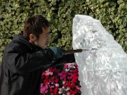そして、ソニービル エントランス前には旭川市出身の氷彫刻家の曽根秀幸氏による作品「氷の旭山動物園」や、本物の流氷などを展示。同スペースで一般来場者に向けたテープカットを行った後は、先着で「北海道の味覚カレーセット」配布などを行った。