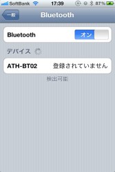 するとiPhone側の画面の「デバイス」欄に「ATH-BT02」が表示されるはず。それをタップすれば「接続されました」と表示されてペアリング完了だ。