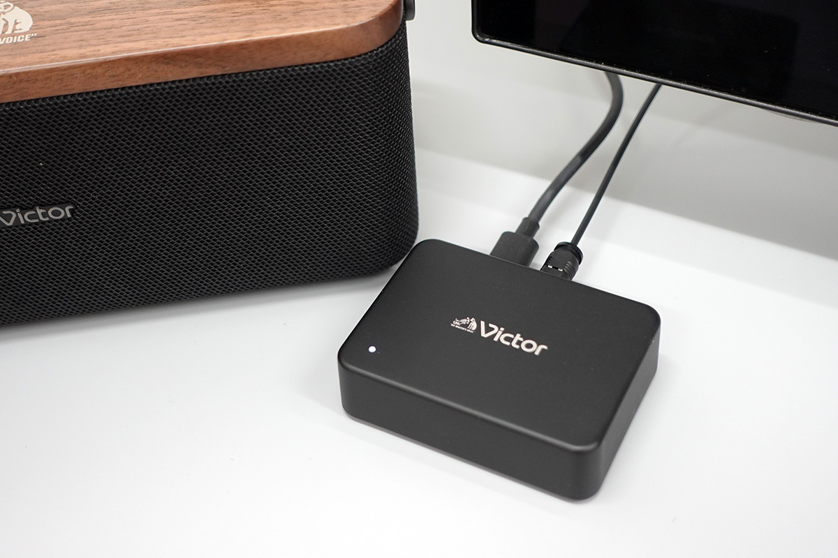 ビクターのSP-WS10BTは、テレビに接続する小さな送信機(トランスミッター)と、バッテリー内蔵のポータブルスピーカーがセットになったテレビスピーカーだ。