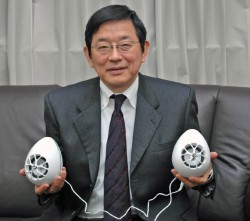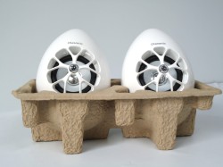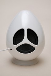 また印象的な卵型のキャビネットにもデザイン性だけでなく音質面での理由があった。「四角形のスピーカーで卵形と同じ容積を確保しようとすると、キャビネットのサイズが2まわりくらい大きくなってしまう。また卵型は四角形より強度に強いこと、平行面がなく定在波が発生しないことからキャビネット内に吸音材を入れる必要がなく容積を100%利用できるなどメリットが大きい。卵型で試作機を作ってみたところプラスチック素材を使用している割には箱鳴りもしないし、このような形は小型スピーカーにマッチしているのだと感じた。同じユニットを搭載した四角形のスピーカーと比較してもその音の違いは明らかだった」。
