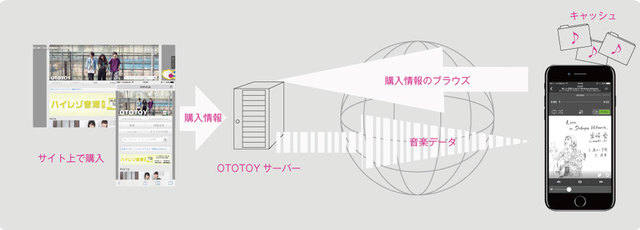 スマートフォンアプリ「OTOTOY」(以下、OTOTOYアプリ)は、楽曲データを端末に配信したうえで再生を実行する。ある意味ではストリーミングといえるが、狭義のストリーミングはRTSPなどのプロトコルに従いリアルタイム性あるデータを制御するもので、OTOTOYアプリはそのような処理を行わない。OTOTOYのWEBサイトで購入手続きを終えた楽曲をスマートフォンにダウンロード、いつ・どこでも再生できることを狙ったものだ。ウェブと同じアカウントでサインインすれば、ケーブルなどで接続しデータ転送する手間なく、購入した楽曲をいきなりスマートフォンで再生できる。