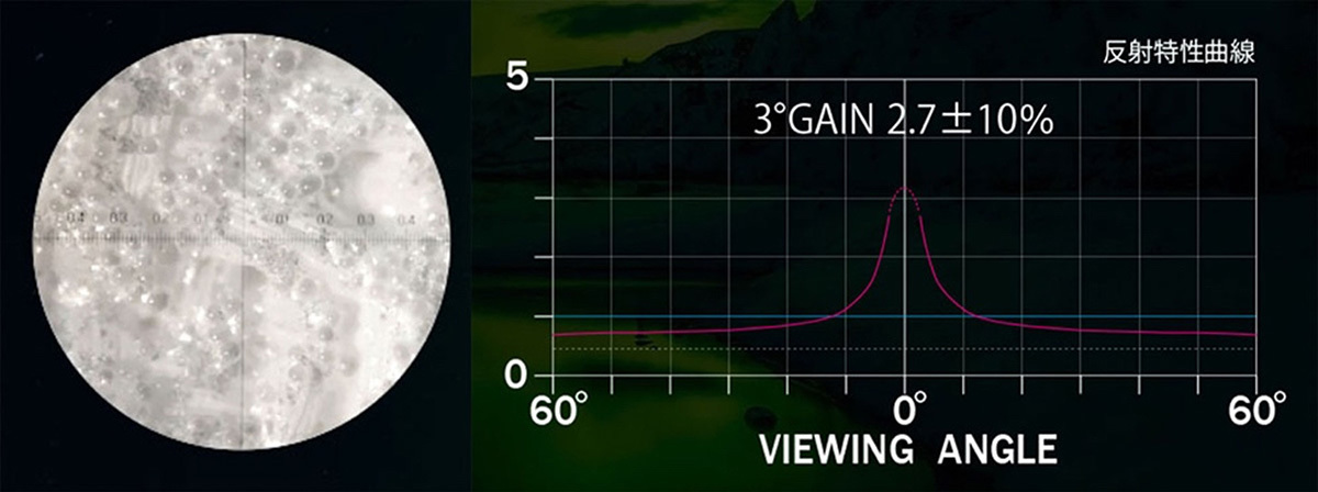 「アキレイll」:4K/8K対応スクリーン BU302。ガラスビーズの密度を高め、有害光(外光)の影響を受けにくい。迷光対策に有効で、白ピークを散りばめた回帰型。8K/4K仕様。3度ゲイン2.5±10%。