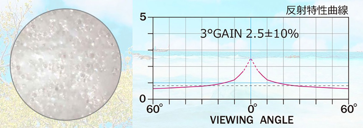 拡散型(ホワイトマット)は投写された光を均一に拡散反射するもので、回帰型(ビーズ)は光が入ってきた方向に反射する特性を持つ。