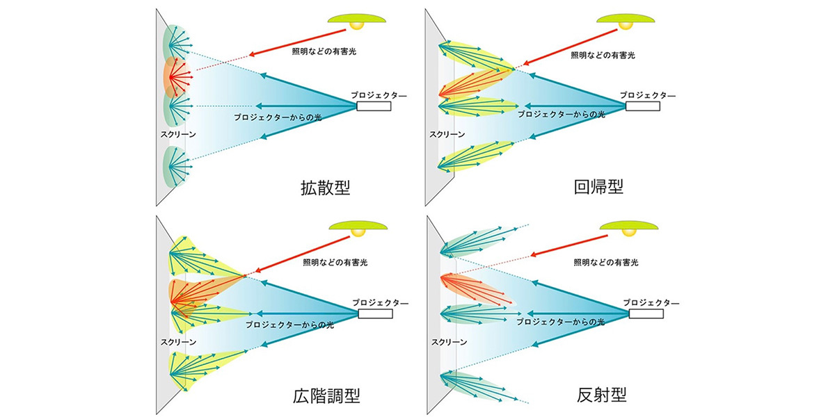 広階調型(HDR適合)は近年登場しているHDRに対応したプロジェクター向けに開発されたタイプとなる。反射型(パール・シルバー)は入ってきた光を鏡面反射するもの。
