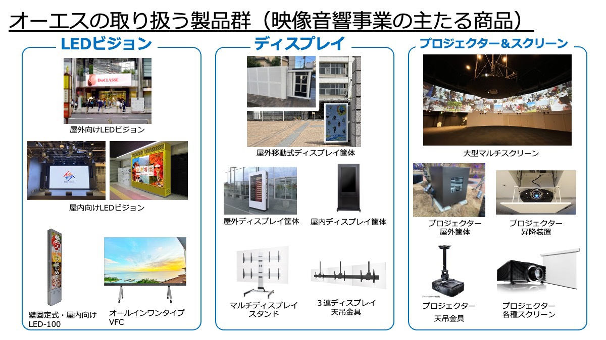 映像・音響事業では、プロジェクションマッピングやサイネージ用のLEDビジョンなどの大がかりなものから、学校や家庭で使用されるプロジェクターやスクリーンまで幅広く含まれる。さらに再生可能エネルギー・防災事業としては薄膜系のソーラーシート、2次電池の移動電源に加えて東京都足立区綾瀬駅前に設置されているオフグリッド電源ポールという独自提案のアイテムも揃えている。