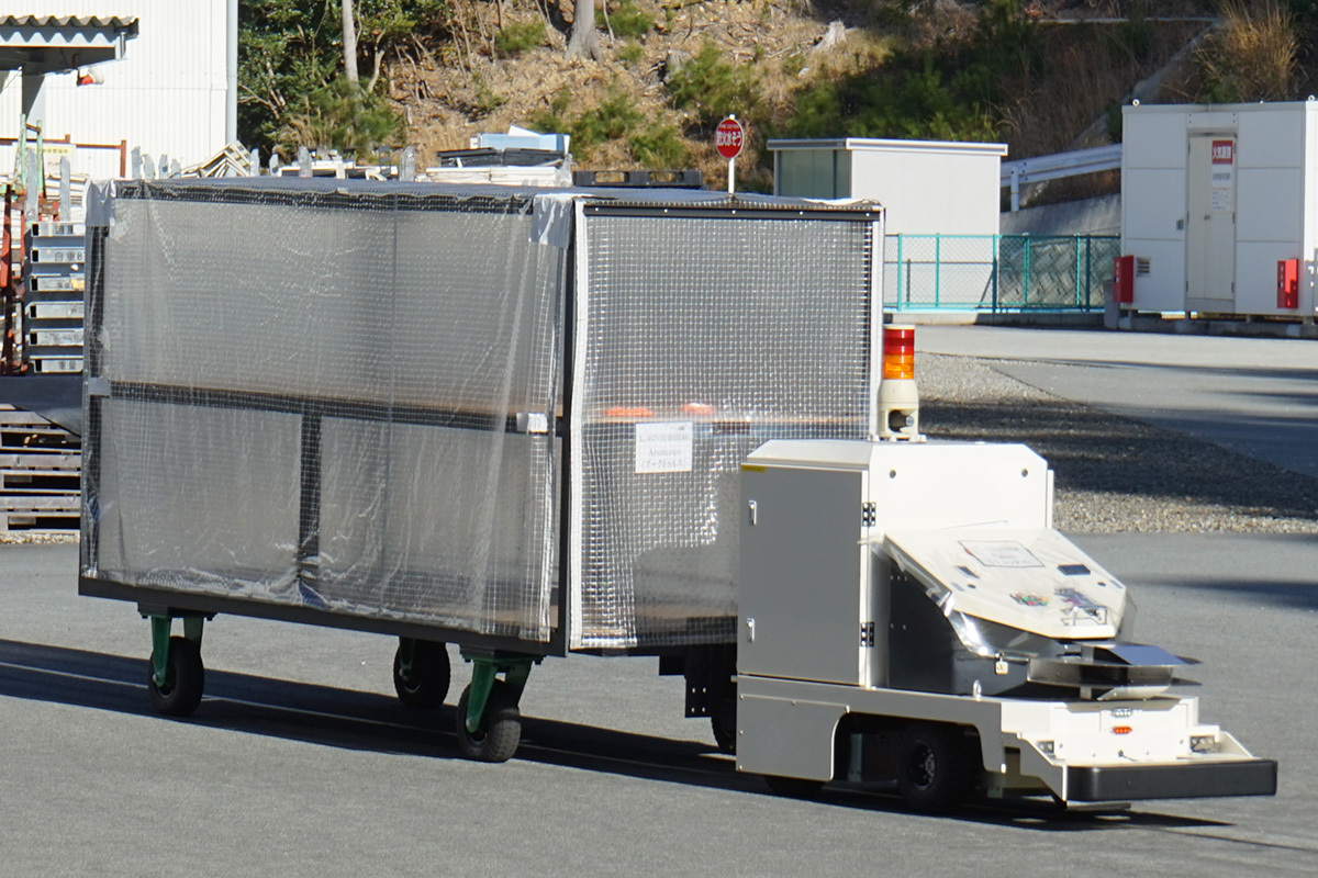工場内では、2台のAGV(無人搬送車)が休むことなく行き交っている。名前はカペラとポルボックス。かつては製造棟から物流部門まで、作業員が重いカートを引いて広い構内を往復していた。