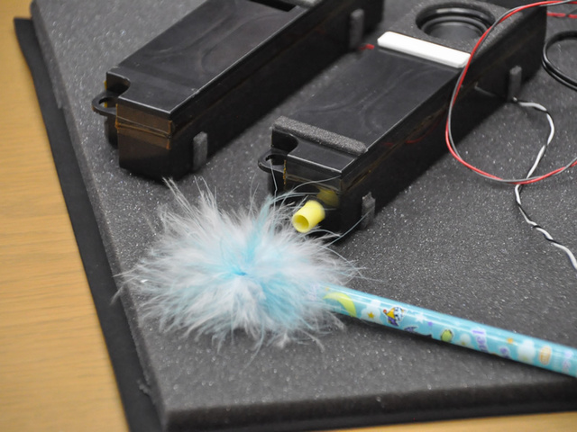 羽根を使ってバスレフポートから放出される空気を実際にテストしている所。音をならすと羽根は勢いよく揺れる。これがノイズ源となる