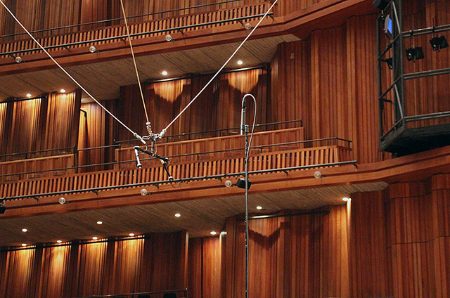 左がメインマイクB&K4006。低めのセッティング。右は弦楽器用のマイク(撮影ポイントの関係で近距離に見えるが、実際はかなり手前にある)