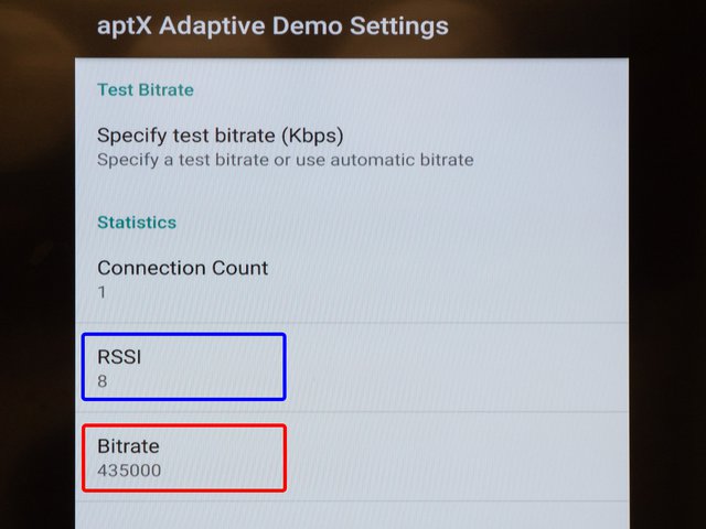 後述する評価ボードを用いたビットレート変動のデモ。青枠が電波状況を示す値で、数字が大きいほど電波が悪い。赤枠がビットレートで、電波状況の悪化に合わせて転送レートを自動的に下げていることが分かる