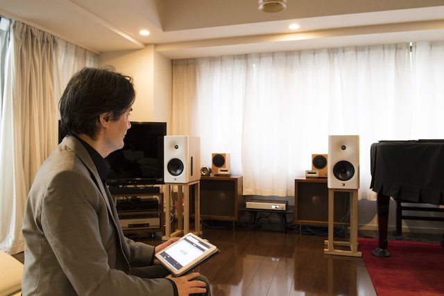 リビングにDutch & Dutch 8cを設置し試聴。使用した音源は、溝口さんの愛聴音源マヌ・カッチェ(フランスのジャズ・ドラマー)の曲のほか、溝口さんの『WORDLESS』から「悲しみの向こう」など