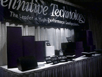 (写真左)本日一番の収穫だったのが、DIFINITIVE TECHNOLOGYのホームシアター用スピーカーシステムたち。井上千岳氏のデモンストレーションルームで一聴するなり、太鼓判を押す。どなたか輸入しませんか?