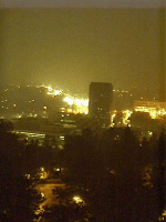 <写真右>どしゃ降りのロサンゼルス。ホテルの窓から撮影